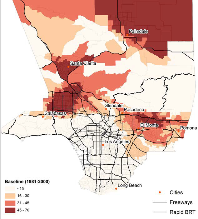 Findings show that the number of extreme heat days are increasing for Los Angeles County. This will have a negative effect on the quality of life and can be dangerous for citizens, especially those with lower incomes who may not be able to afford the increased utilities costs of living in extreme heat.